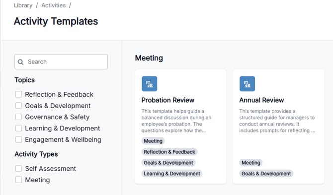 Activity Templates – structured meeting templates (e.g., probation or annual review)