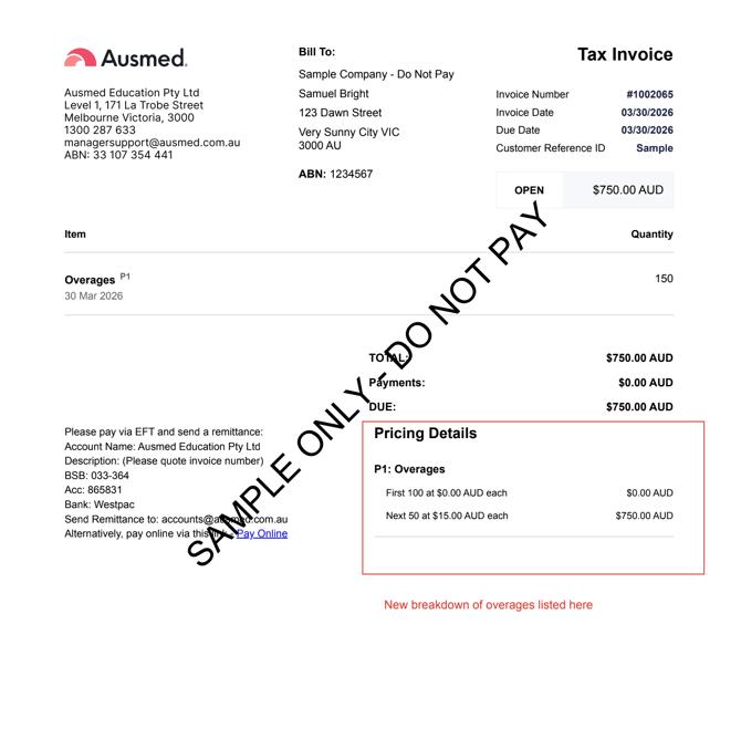 Contact managersupport@ausmed.com.au with your organisation name and the relevant invoice period.